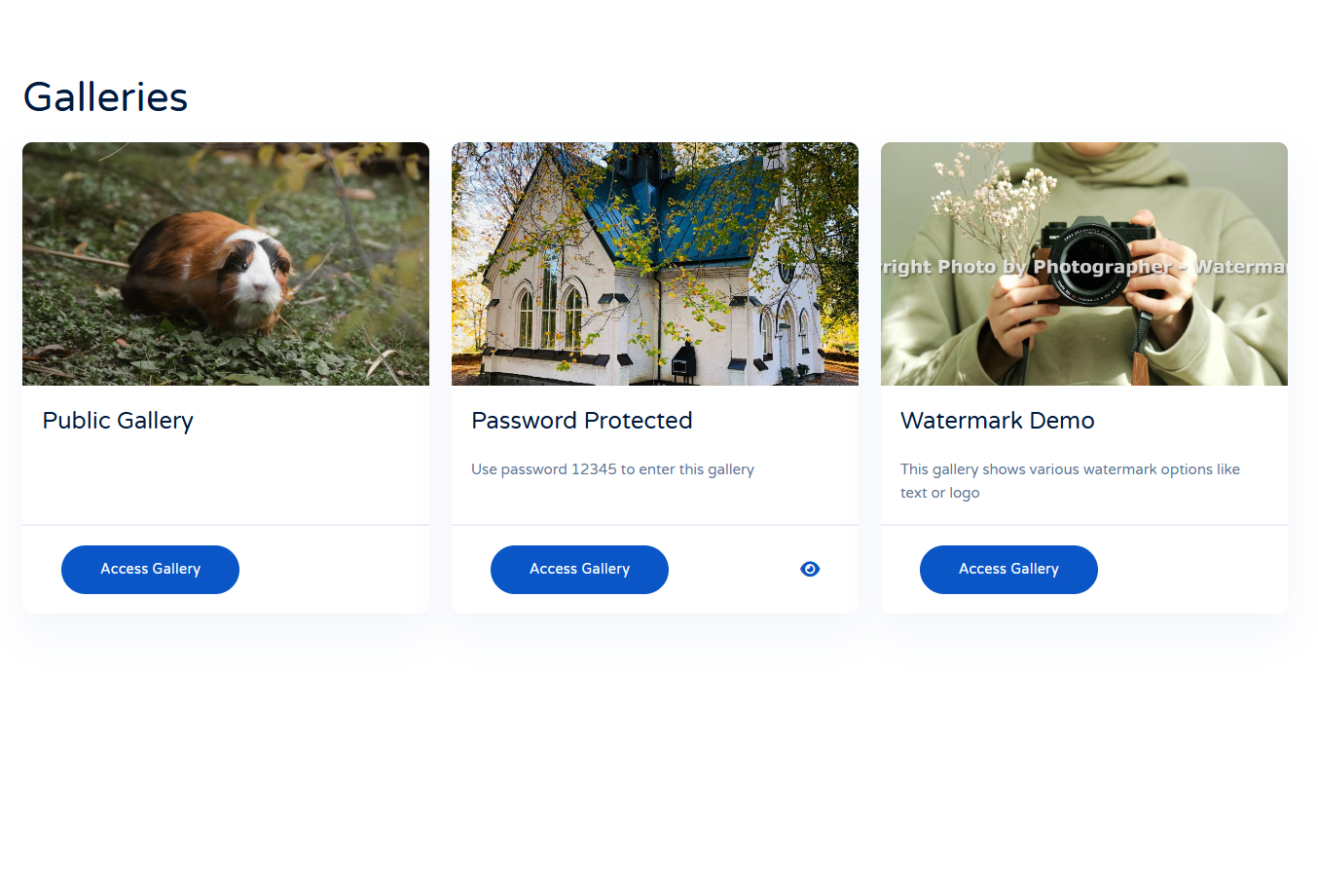 Keep private moments private. Easily secure any gallery with a unique password, ensuring that only authorized clients with the correct credentials can access and view their photos. It’s simple, secure, and essential for modern photography businesses.