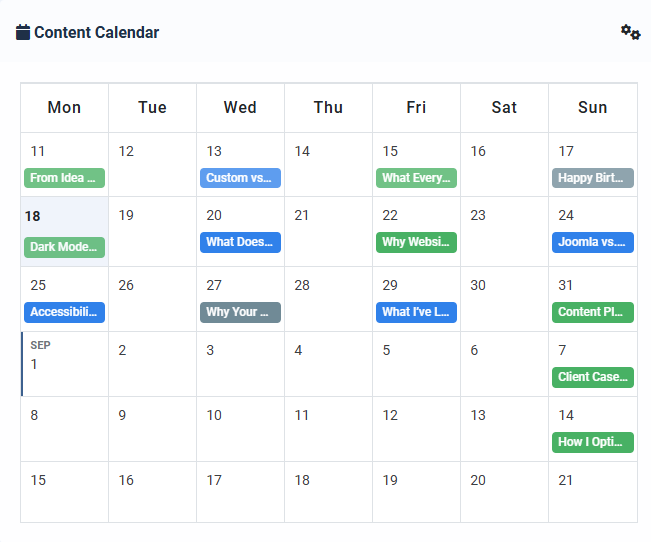 The PRO version takes the module to the next level. With drag-and-drop functionality you can easily reschedule articles, while the option to add new articles directly makes your workflow even faster. Custom colors help you distinguish categories, tags or authors at a glance, and the clear week view gives you better insights into your content planning, so you stay in control of what goes live and when.